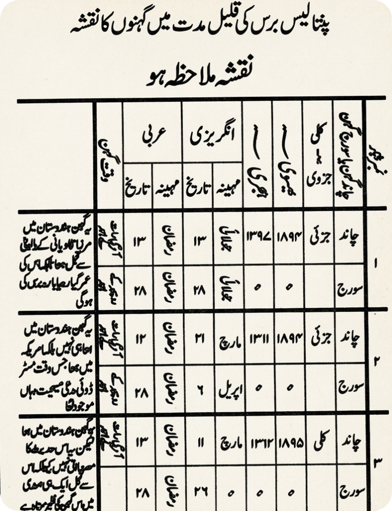 2۔ اُس کے زمانہ میں1267 ھ مطابق1851ء رمضان میں خسوف و کسوف کا اجتماع ہوا۔